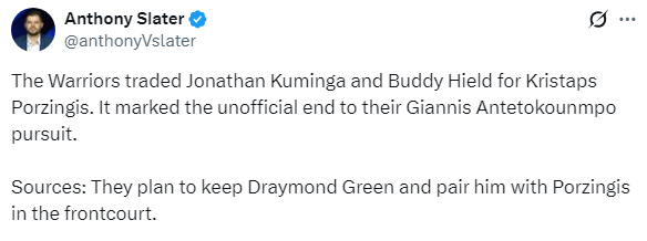 勇士队记Anthony Slater报道,球队消息源称,勇士交易库明加和希尔德得到波尔津吉斯,这代表着勇士对于字母哥的追求已经非正式地结束了。